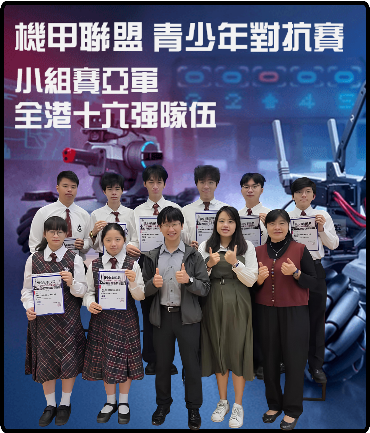 為擴闊學生視野及培養同學的創意和數理思維,本校共9位學生參加七月舉辦的「2025 機甲聯盟 - 青少年對抗賽(中學組)」,並獲得分組亞軍及首次晉身16強,不枉過往數月的艱苦訓練。