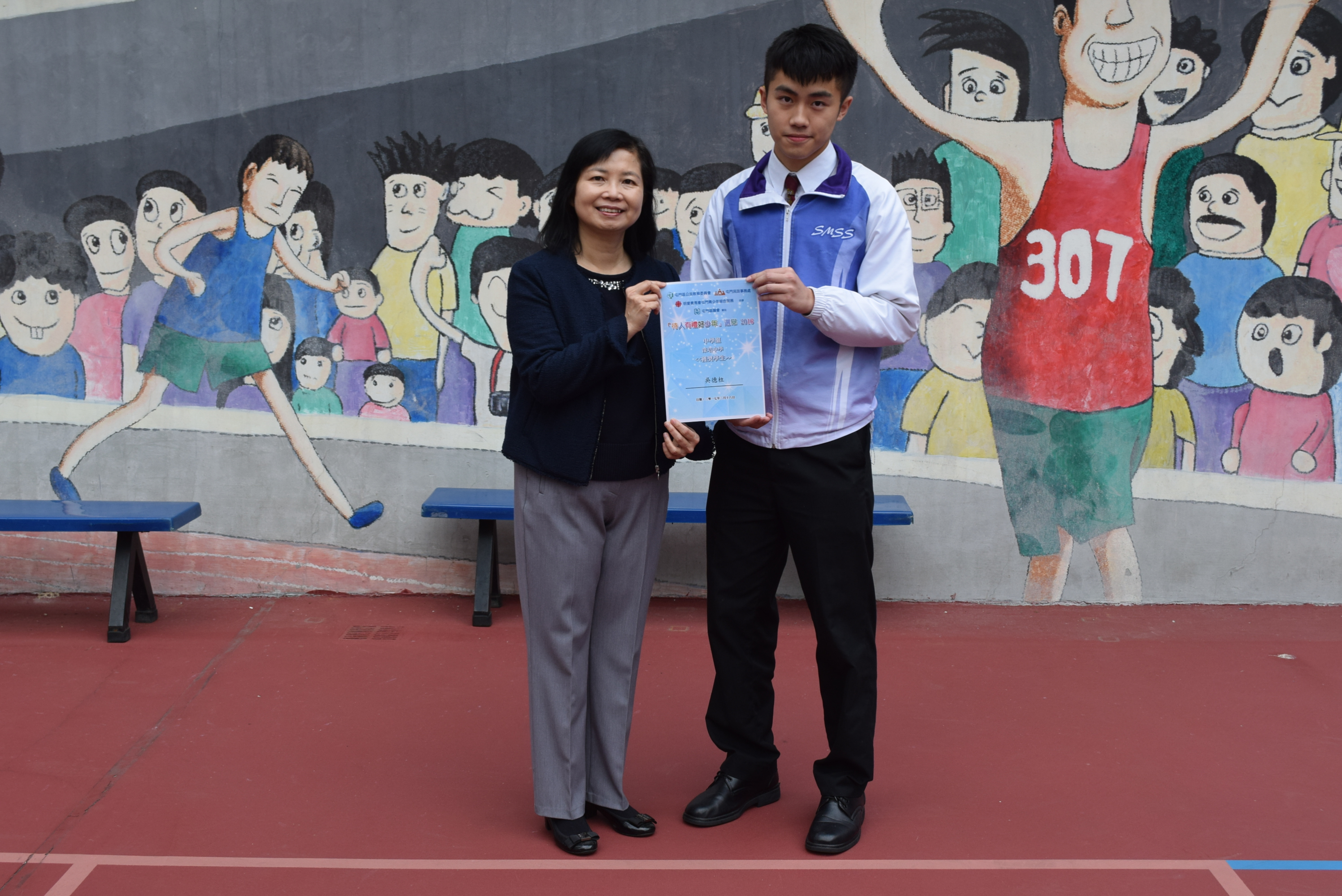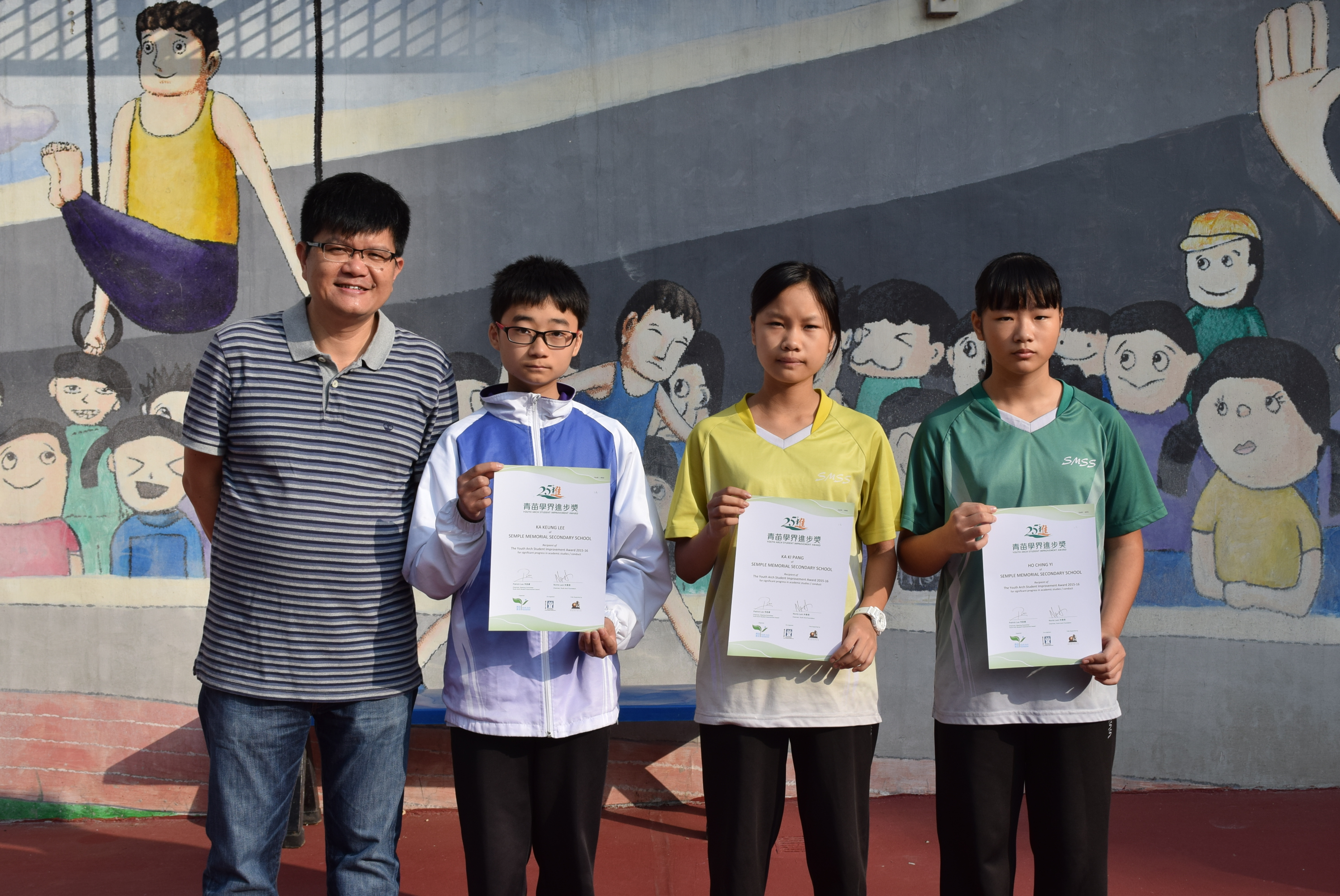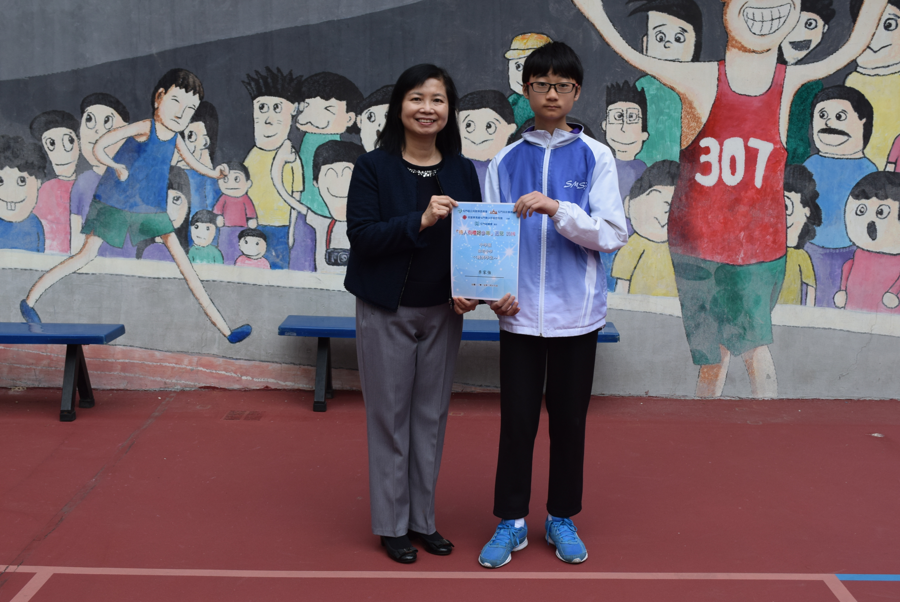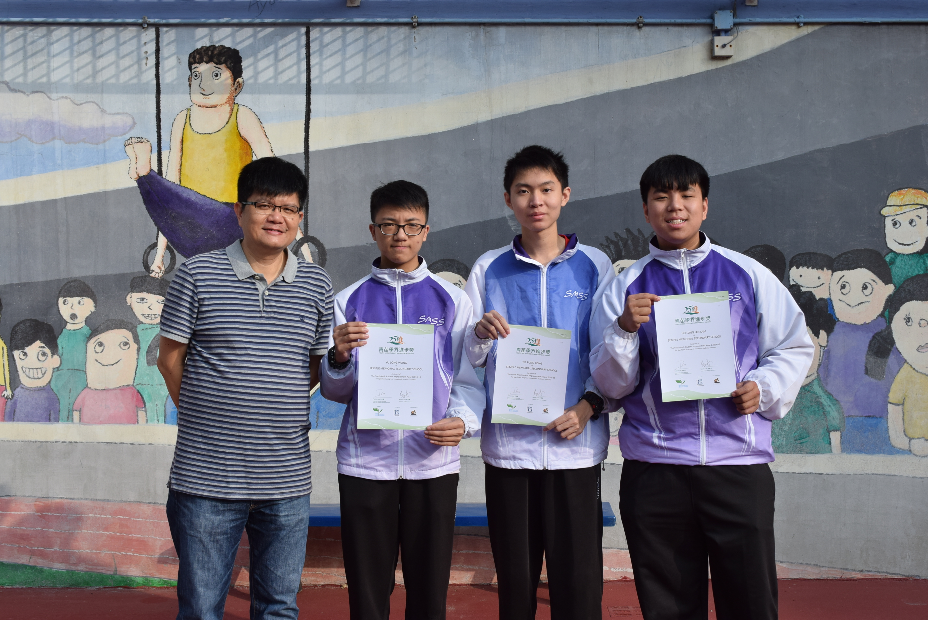 本校學生在屯門區公民教育委員會「待人有禮好少年2016」選舉中獲獎,以表揚學生日常對家人、老師、同學及其他人「待人有禮」的傳統美德。本校獲獎學生為2A李家強及4A吳德柱。