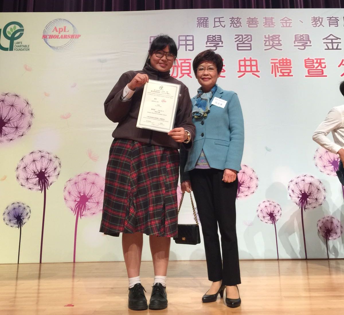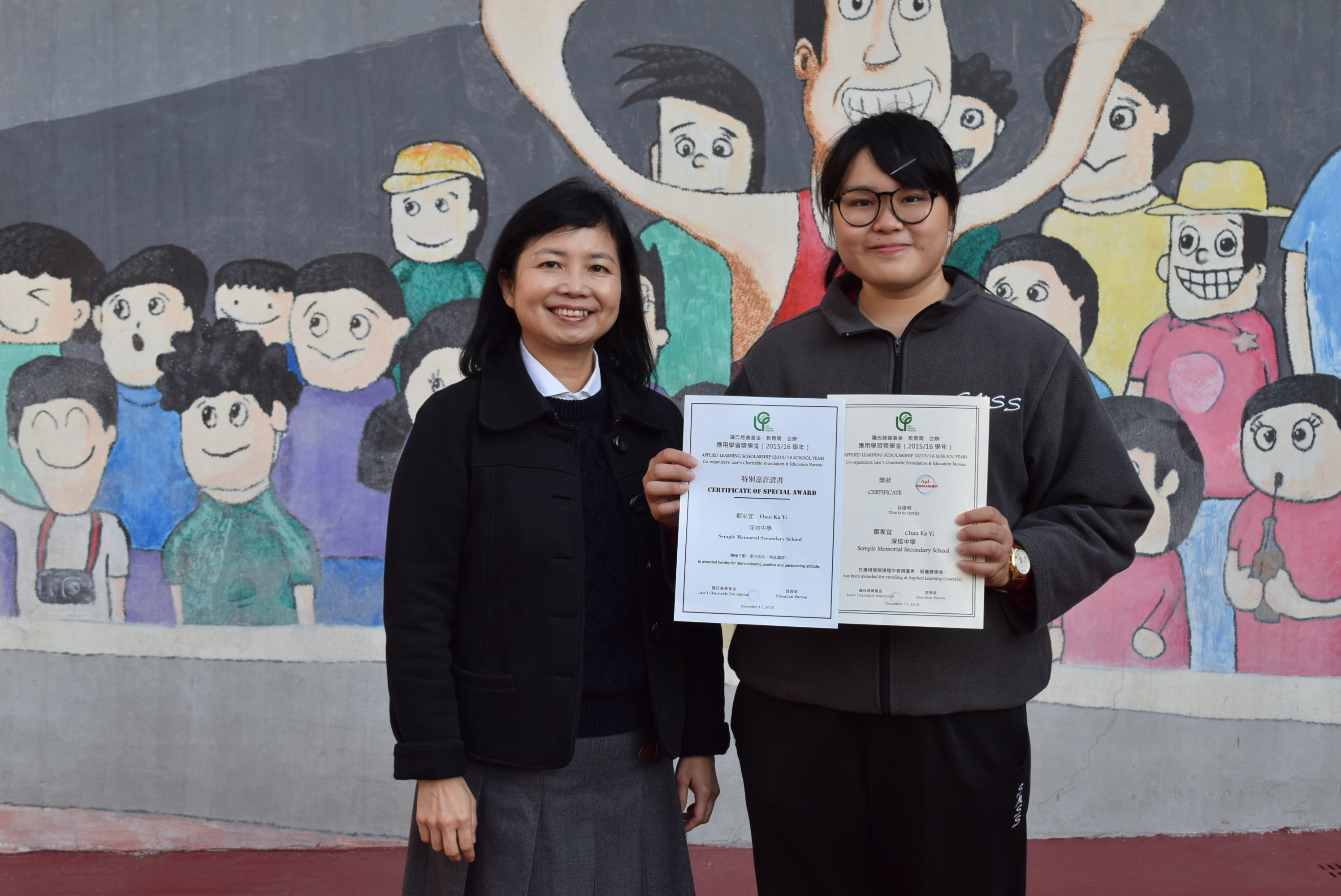 為了提高社會人士對應用學習課程的認識和關注,嘉許於課程中表現優秀的學生,羅氏慈善基金設有應用學習獎學金。本校6C鄒家宜同學由於表現理想,其學習經歷足以勉勵身邊同學,因此同時獲得「特別嘉許」獎。羅氏慈善基金特頒發證書及獎金$2,000。謹祝賀鄒家宜同學百尺竿頭,更進一步。