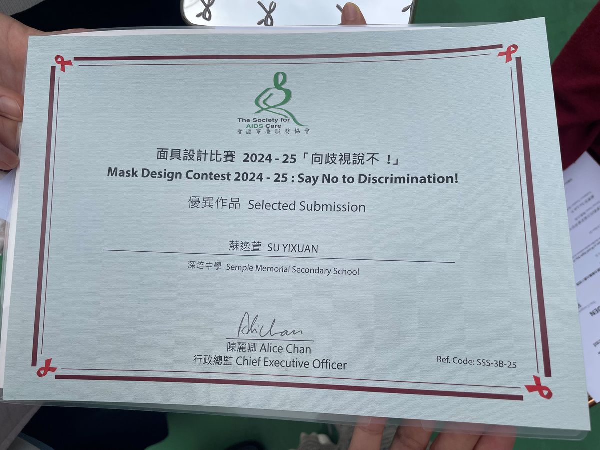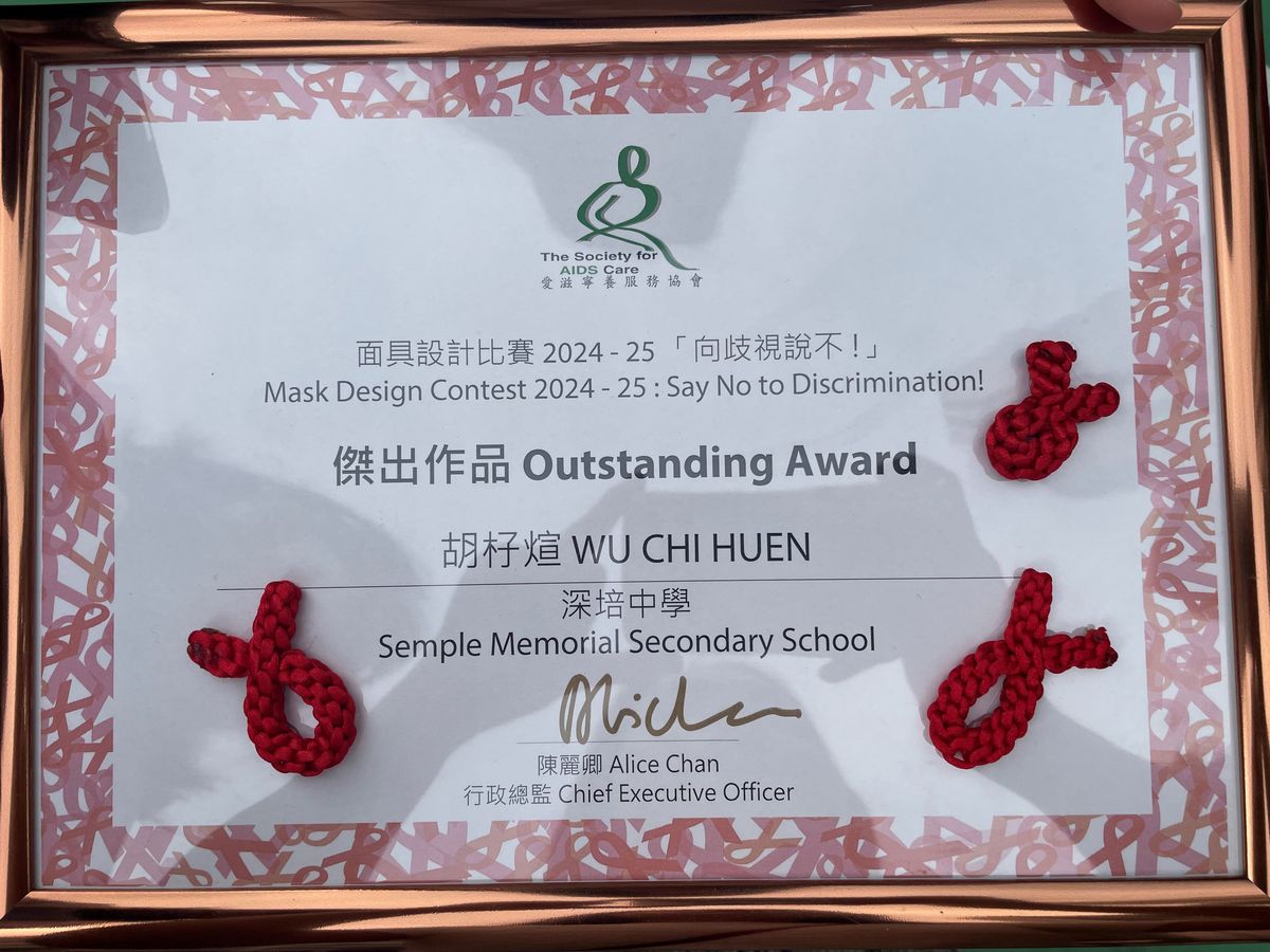 此外,深培中學的同學還參加了由愛滋寧養服務協會主辦的2024-2025年度「向歧視說不!」面具設計比賽。本校同學均能入圍,其中兩位同學的作品被評選為優異作品和傑出作品。透過參加這次比賽,同學們深入了解愛滋病感染者所面臨的困難,旨在消除歧視,並透過創作面具發揮創意,表達對愛滋病感染者的接納。