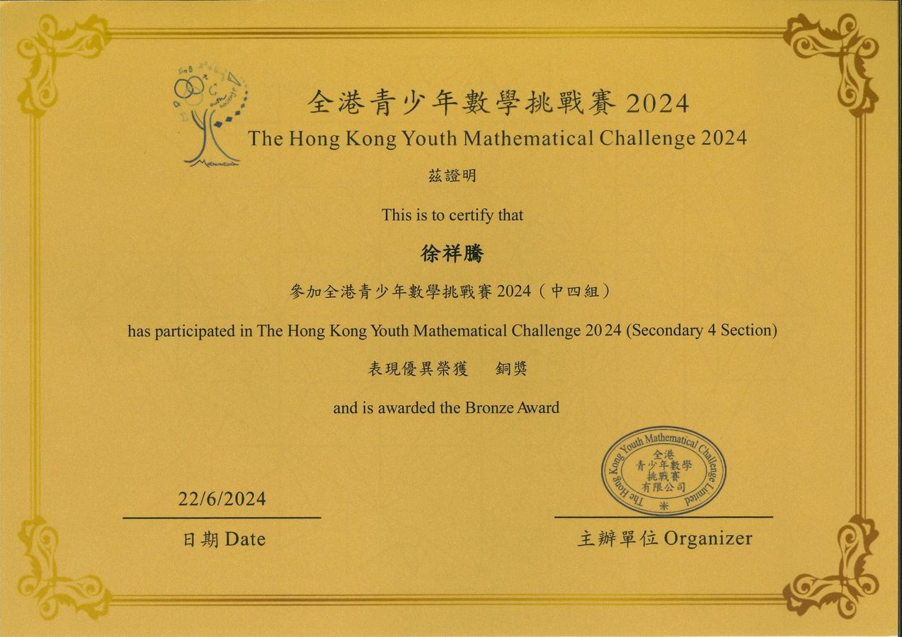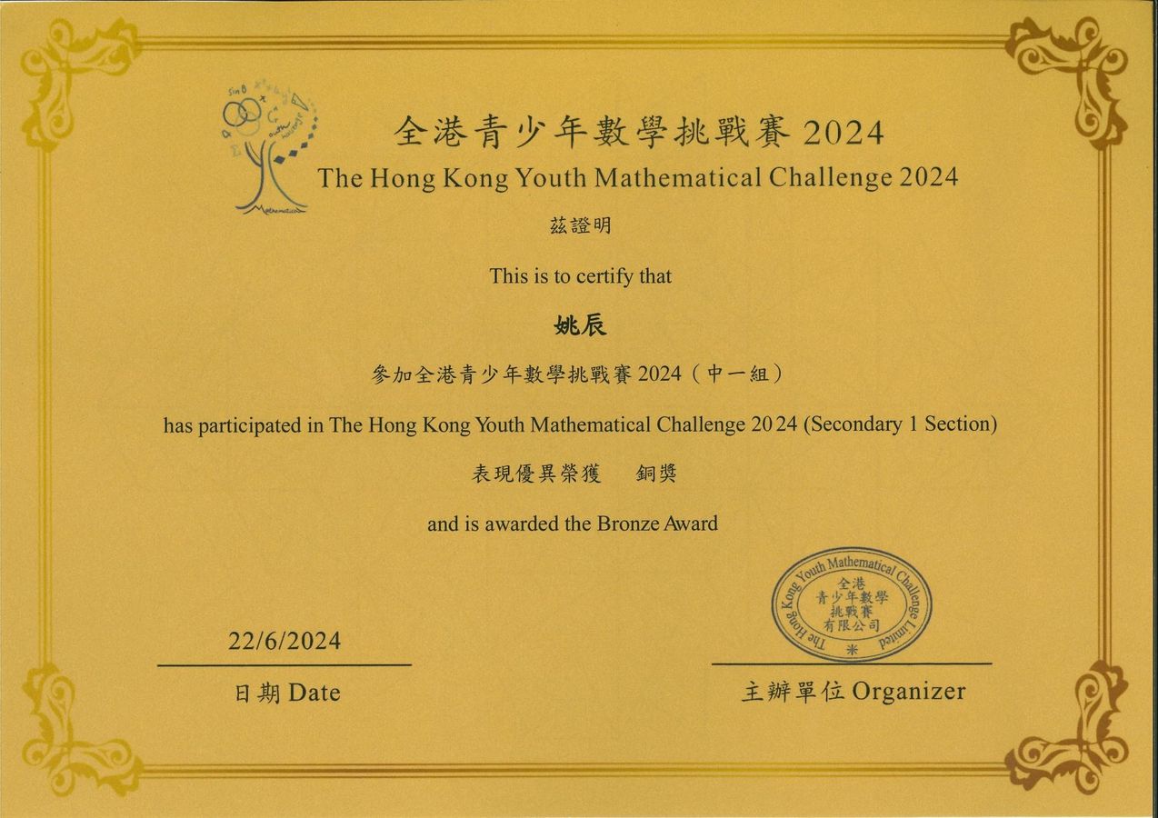 為培養學生的數學思維和數學解難能力,本校共12位同學參加六月舉辦的「全港青少年數學挑戰賽2024」,其中3位同學更獲得以下獎項: