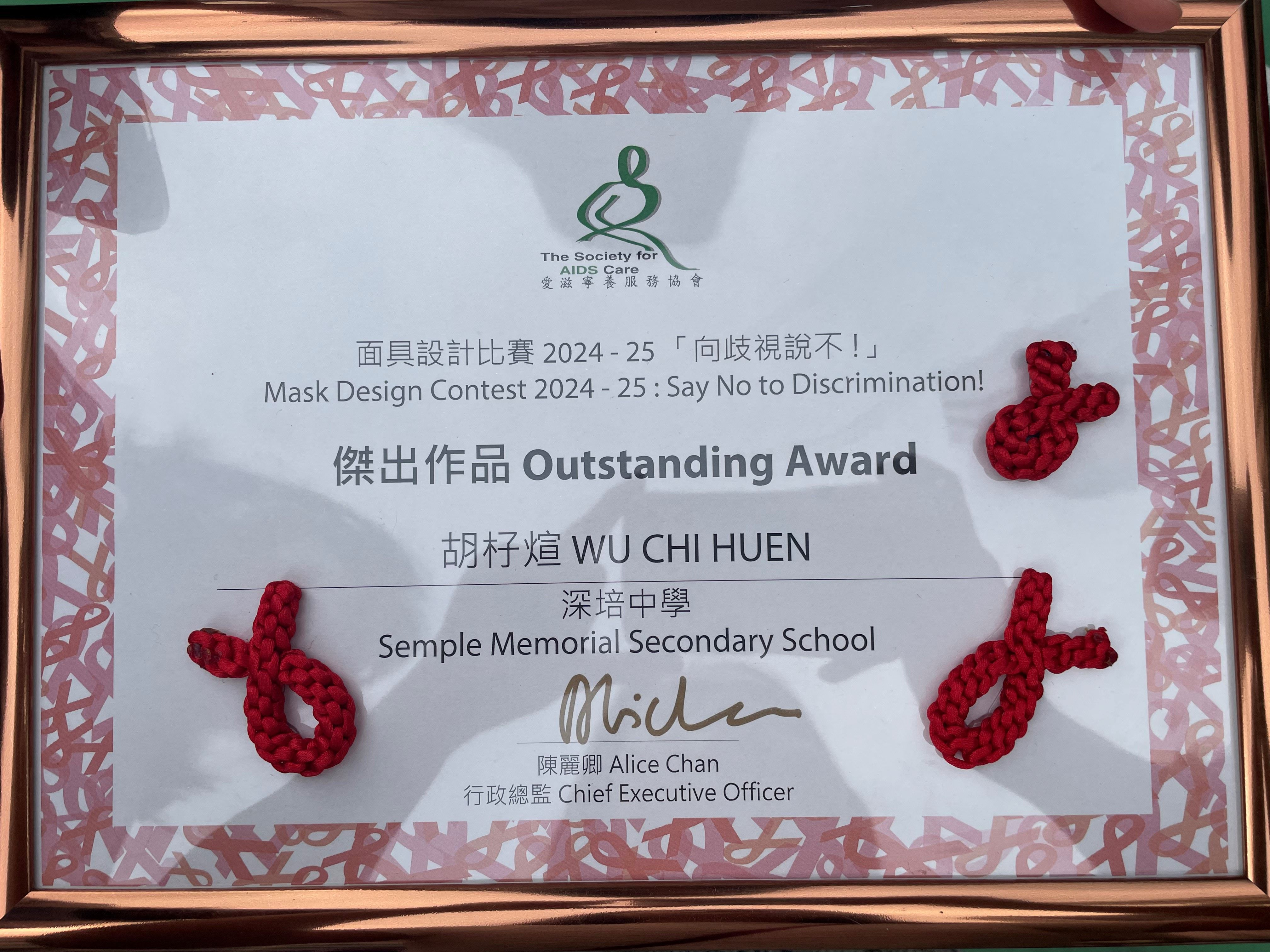 此外,深培中學的同學還參加了由愛滋寧養服務協會主辦的2024-2025年度「向歧視說不!」面具設計比賽。本校同學均能入圍,其中兩位同學的作品被評選為優異作品和傑出作品。透過參加這次比賽,同學們深入了解愛滋病感染者所面臨的困難,旨在消除歧視,並透過創作面具發揮創意,表達對愛滋病感染者的接納。