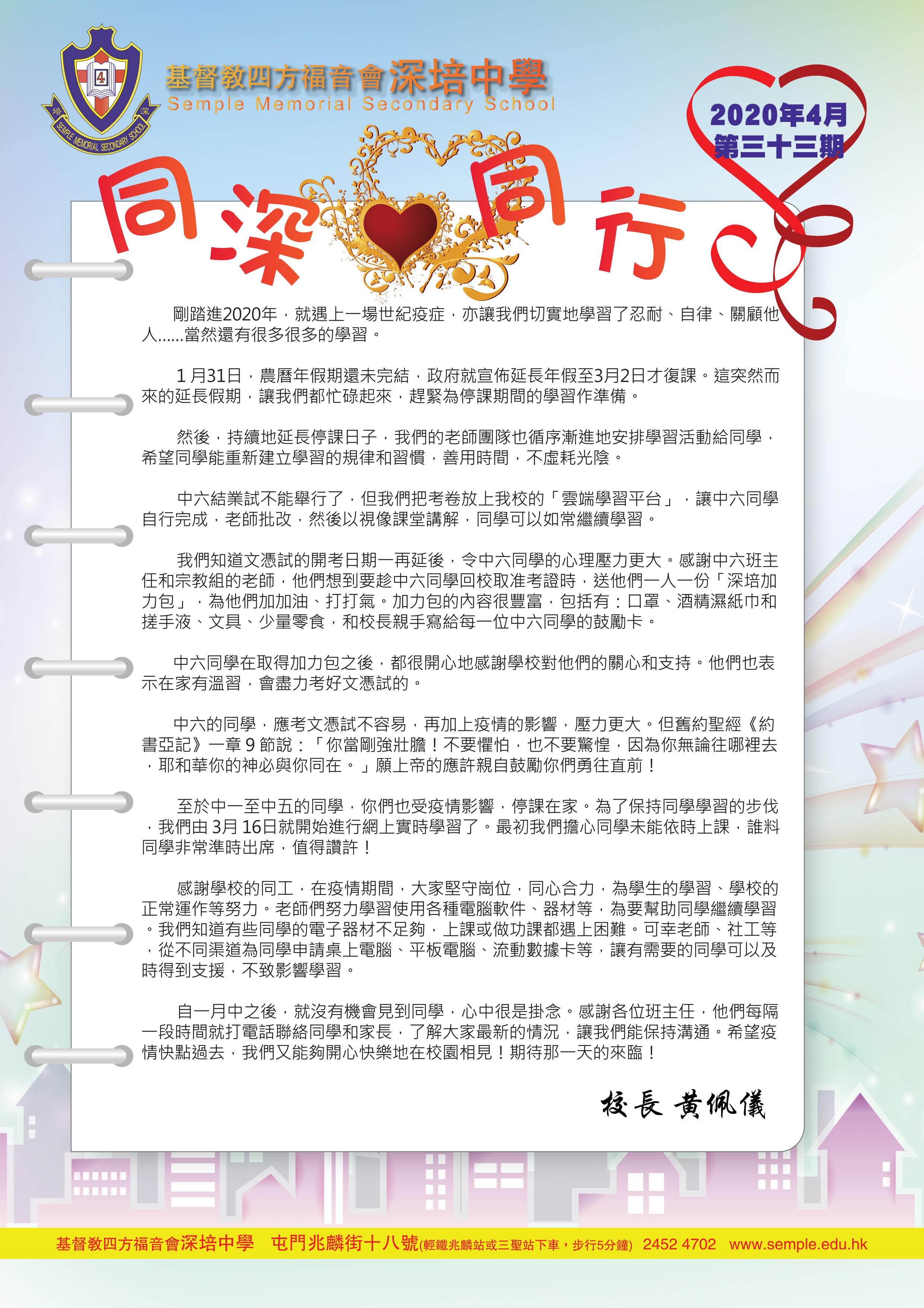 2025年9月,我有幸接棒成為基督教四方福音會深培中學的新任校長,感恩!深培中學在1967年創校,以基督精神辦學,培育學生在德、智、體、群、美、情、靈各方面,均衡發展,終身學習,服務社群,貢獻社會及國家。過去五十多年深培中學在李伊雲牧師、威霖仕牧師、曾顯明校長、郭月娟校長及黃佩儀校長的帶領下,專心教育,盡心盡力幫助學生成長,榮神益人。我能於此時此刻接任校長,深感神恩浩大!