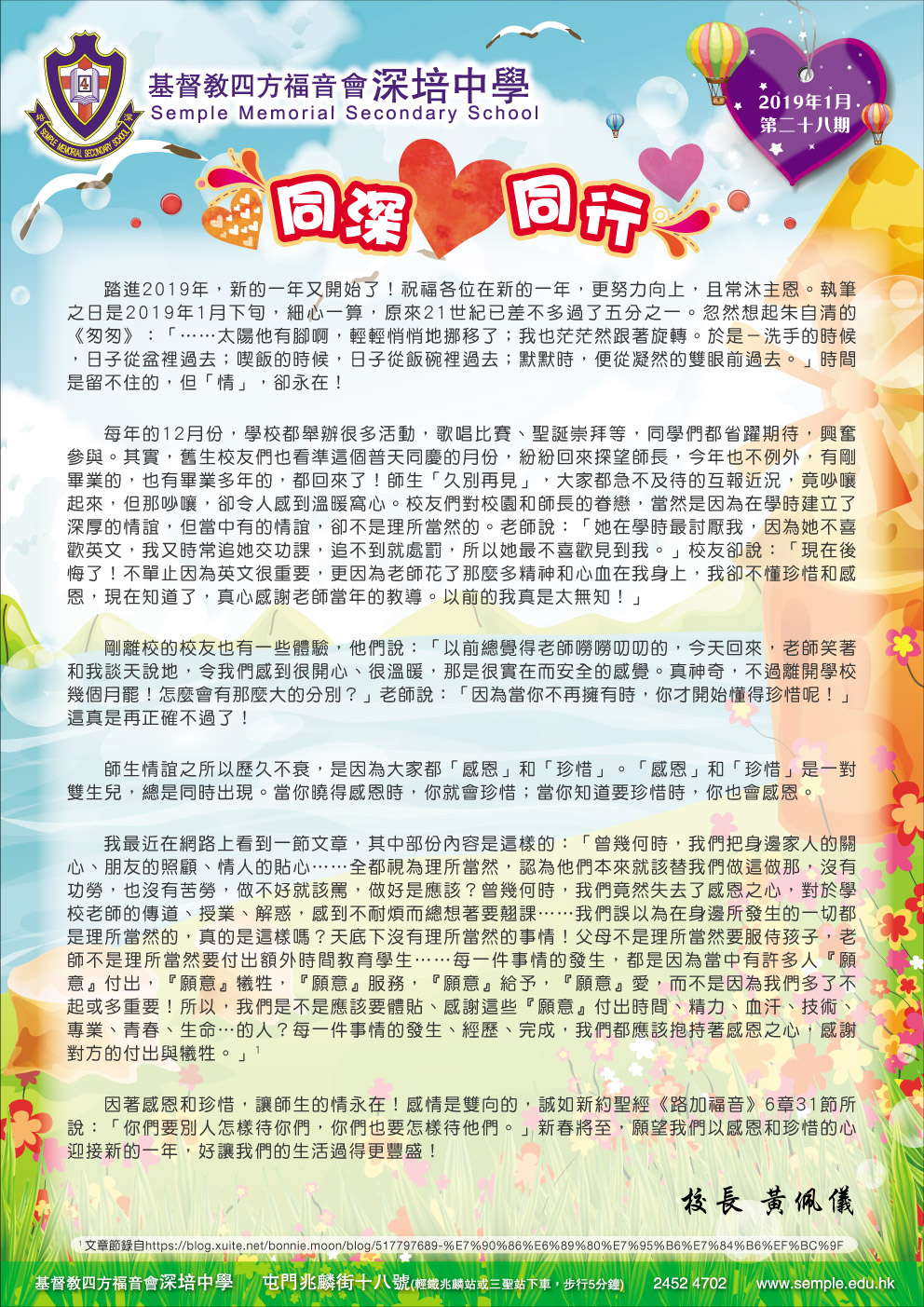 期望我能和全體老師共同本著基督精神、謙卑服侍、乘風破浪,與學生們、家長們同「深」同行,面對不同的挑戰,讓每位深培的學生能夠在愛中學習與成長。
